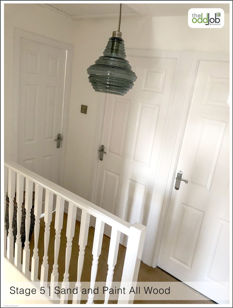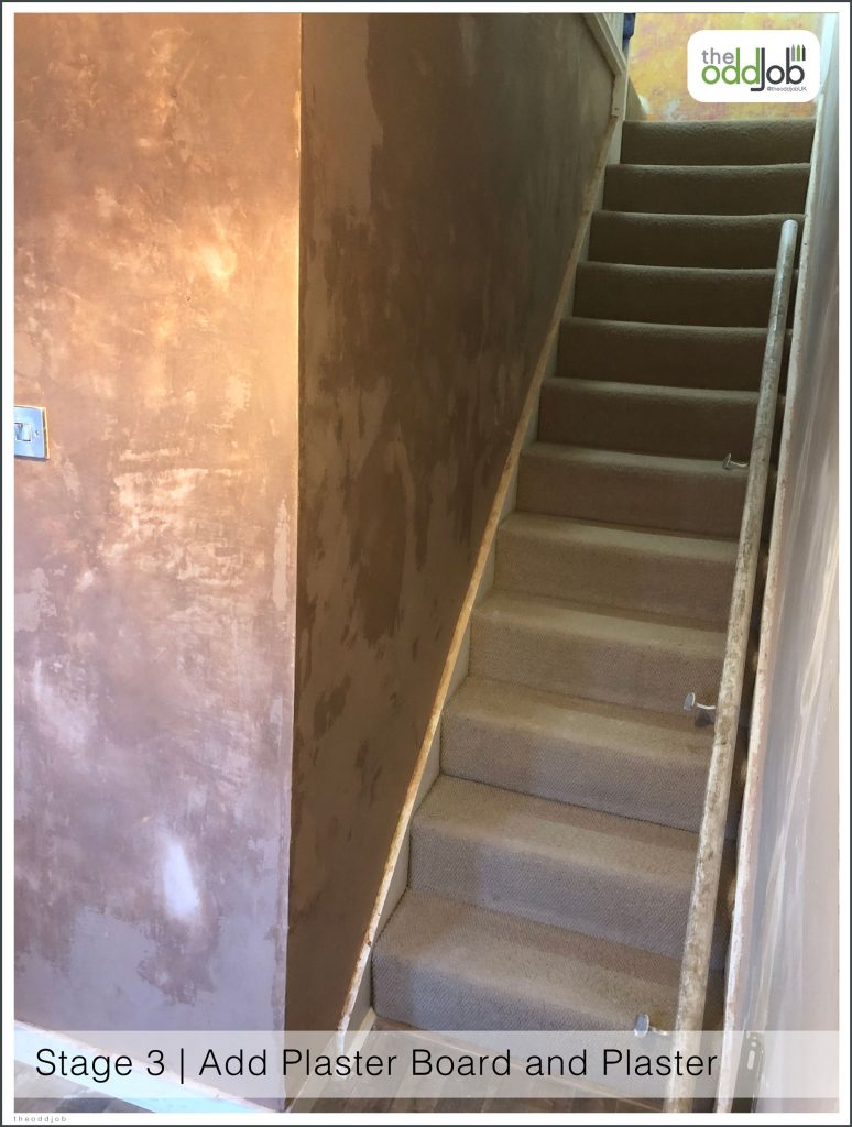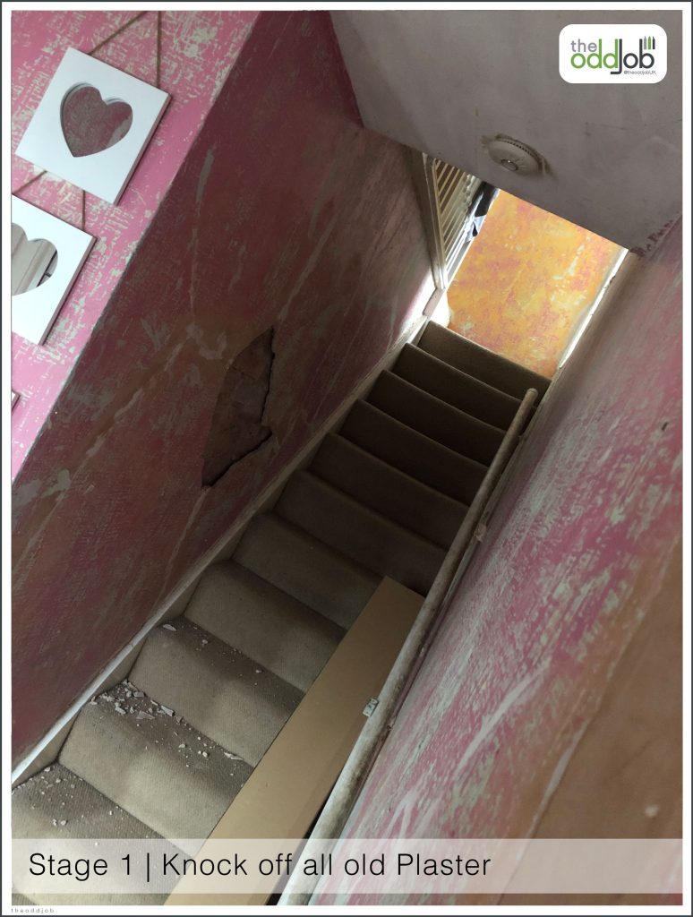 Hall Way and Stairs Re-plastered. All the Old Plaster Crumbling off after Wall paper Removed. Knock off all Old Plaster, add new Plaster Board, Re-Plaster, Sand all Wood down then re paint all walls and wood. @theoddjobUK